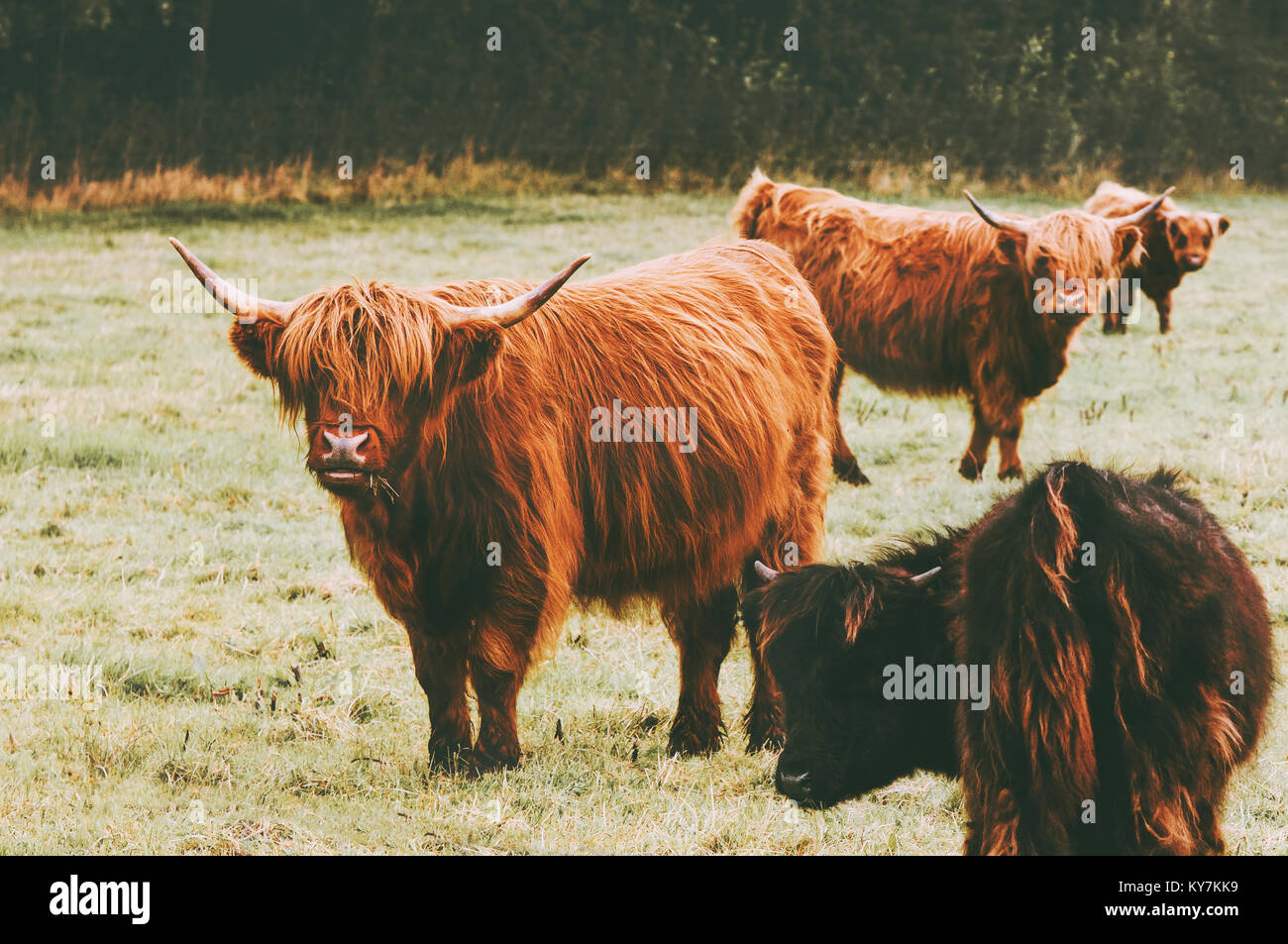 Highland Rind Kuh Gruppe Tiere Lange Haare Und Horner Klassische Schottische Rasse Stockfotografie Alamy